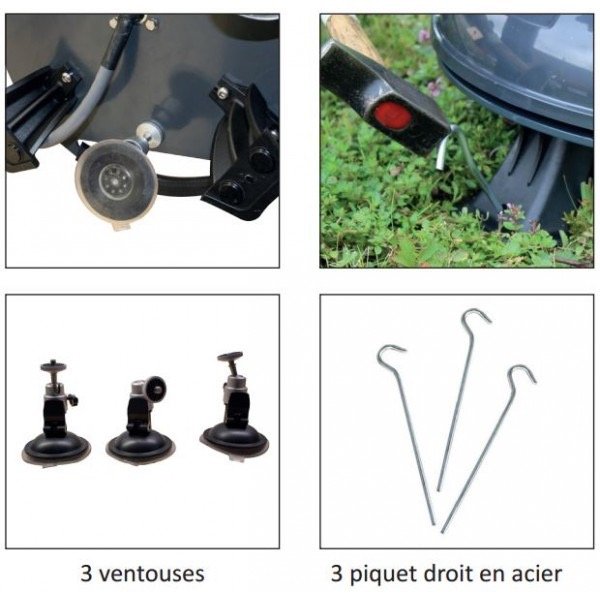 - Fournie avec 3 ventouses et 3 piquets en acier