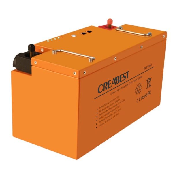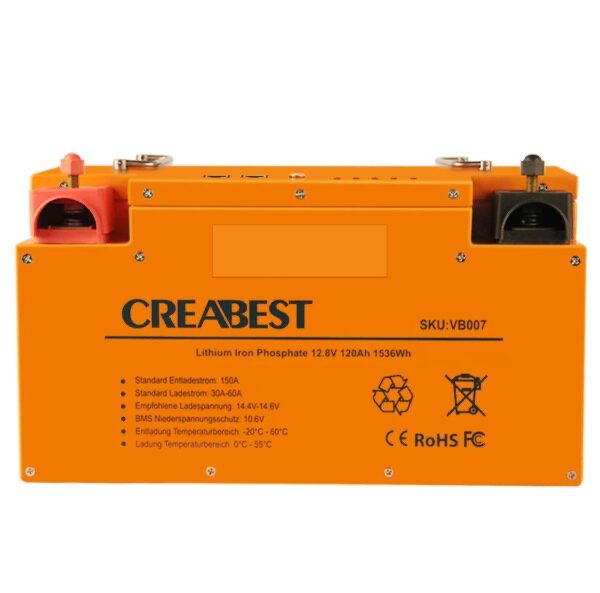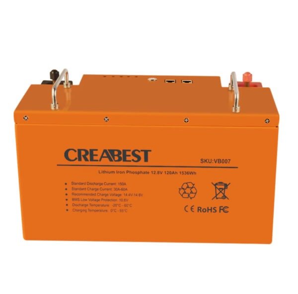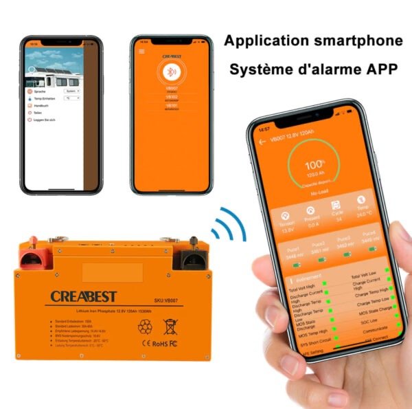 Contrôle intelligent BMS : tension, courant, température. Application smartphone : suivi en temps réel des données de la batterie. Système d’alarme APP: dépannage à l’avance. Avec bouton : éteignez complètement la batterie, longue durée de stockage. Sortie à courant élevé continu 150A: prend en charge les appareils à haute puissance. Courant de décharge max 180A. Plus de 3000 fois le cycle profond : 80 % du DoD. TAILLE: 356MM*169MM*200MM 356MM*169MM*200MM POIDS NET: 20KG 20KG CHARGEUR: SANS CHARGEUR 30A SANS CHARGEUR 30A AVEC CHARGEUR 30A Spécifications du produit (série VB007) Tension 12.8V Type de celluleLiFePO4Capacité120AhTempérature de décharge-20°C -60°C Énergie totale1535WhTempérature de charge0°C -55°C Courant de Décharge Continu Max150A Température de stockage-20°C -60°C Courant de décharge max180A Type de borneM8Courant de charge standard30A-60ALa communicationRS232Tension de charge recommandée14.4V-14.6V Terminal de communicationPas ouverteProtection basse tension BMS10.6V Poids net 20KG Série / parallèle-4S1PDimensions356x169x200mmLa résistance≤10mΩOnduleur12V 2000W