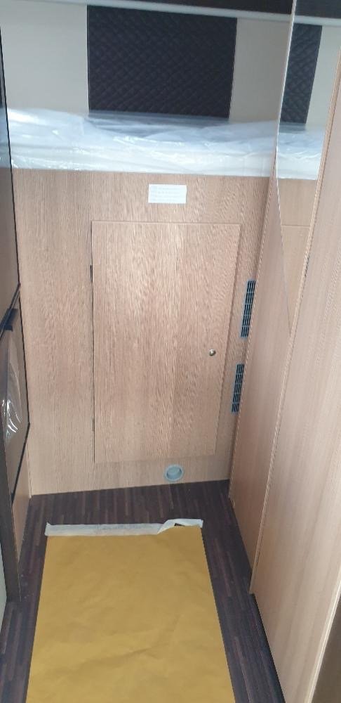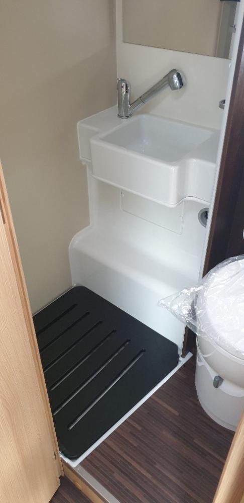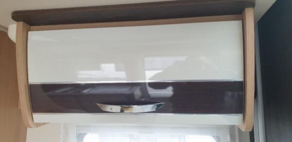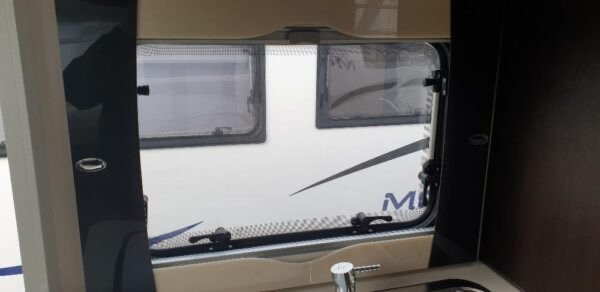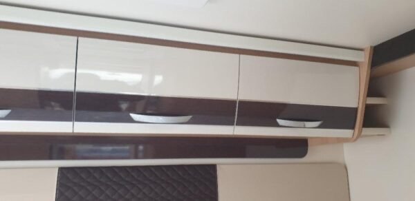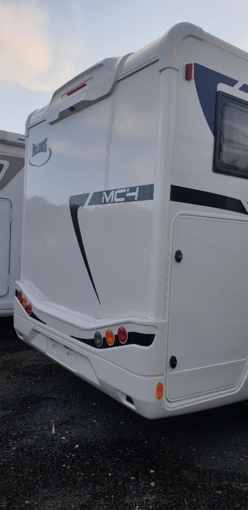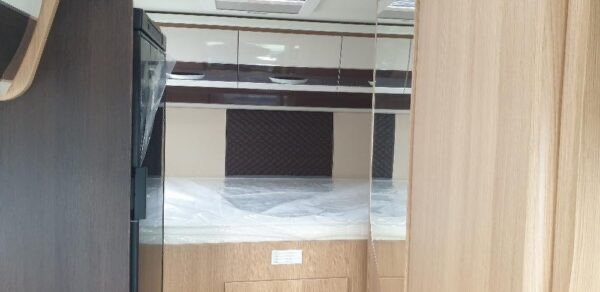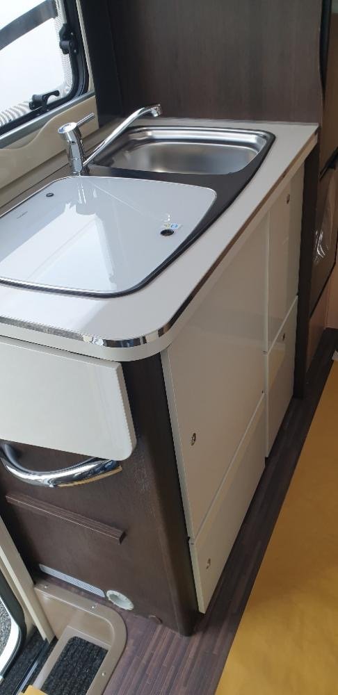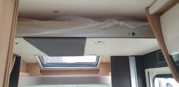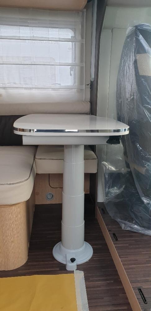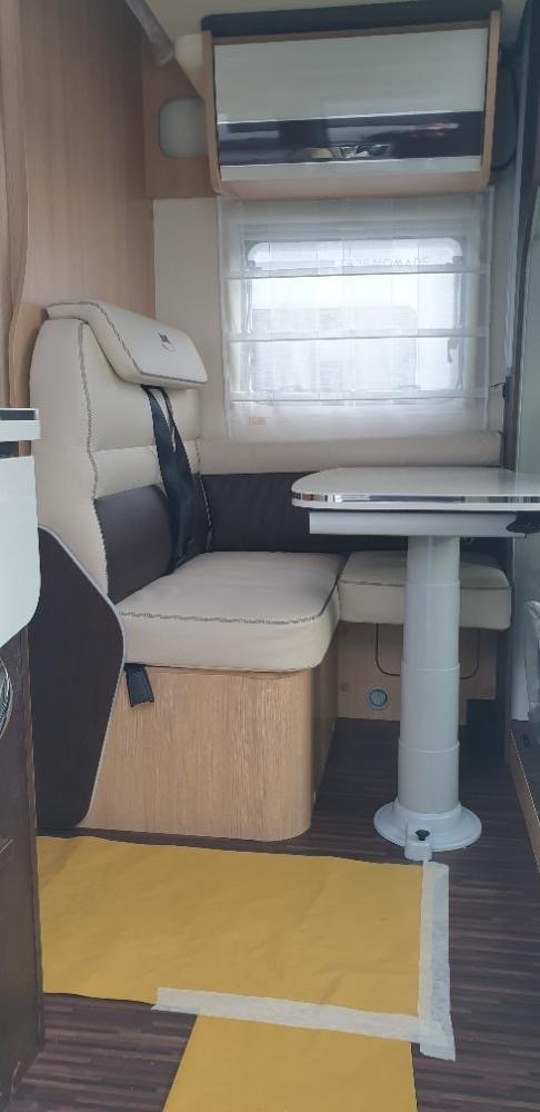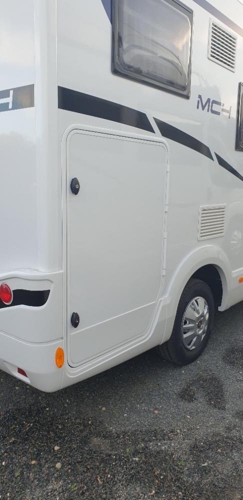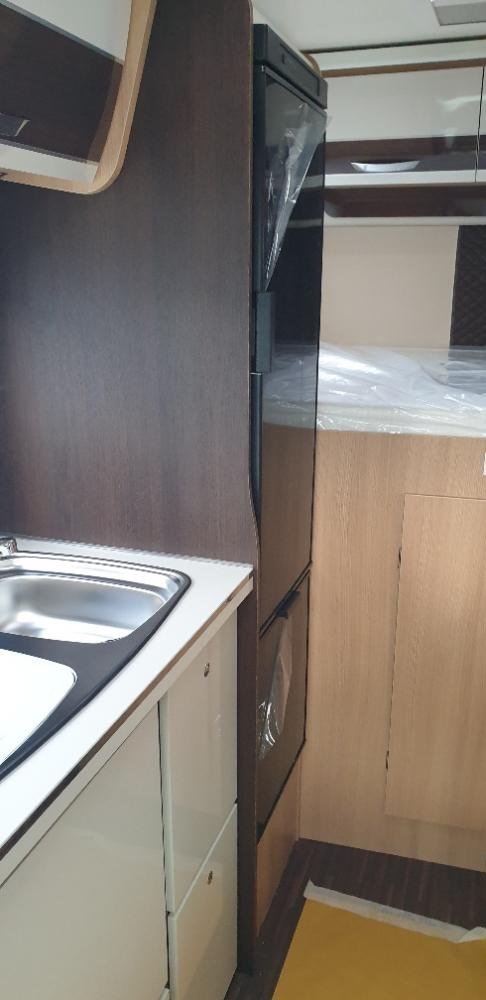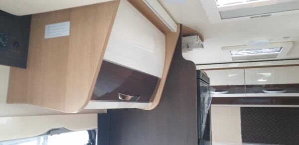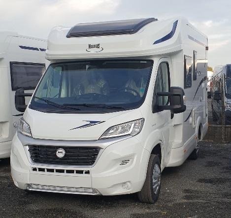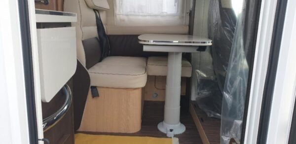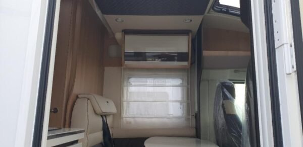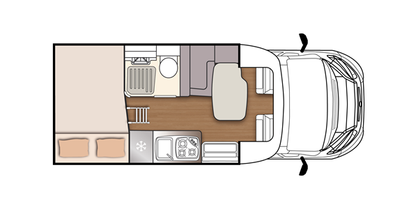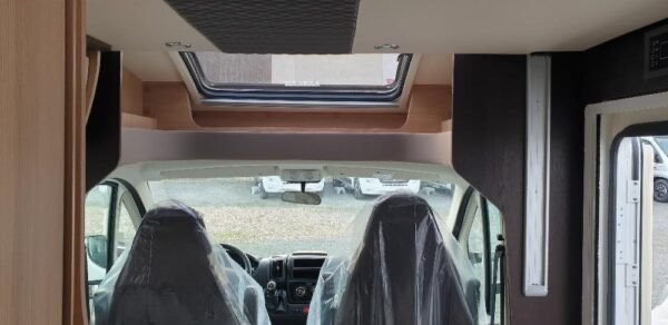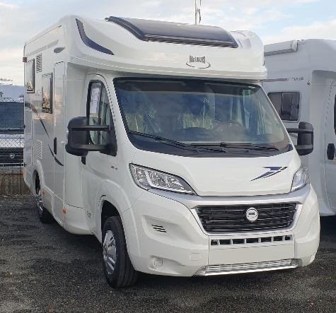 - Petit profilé de moins de 6 mètres comprenant un grand salon avant panoramique avec banquette en L, salle d’eau avec douche séparée, lit transversal sur soute garage, lit de pavillon et cuisine latérale avec de nombreux rangement.