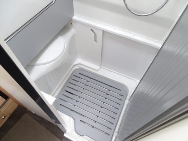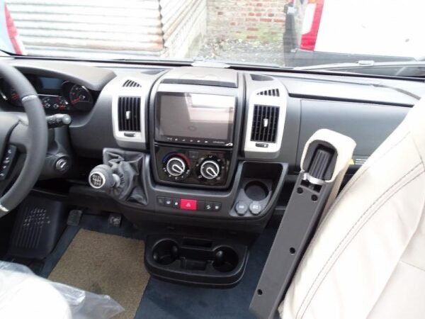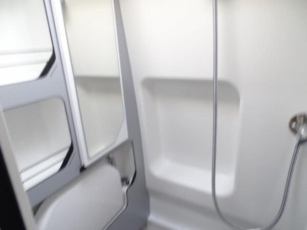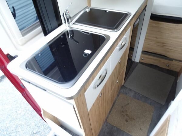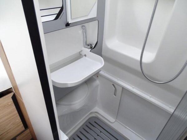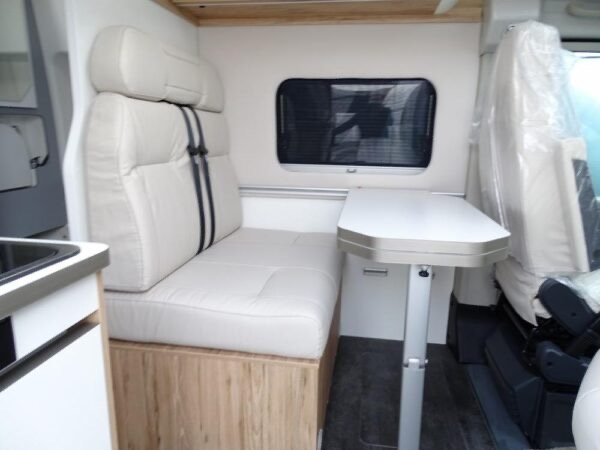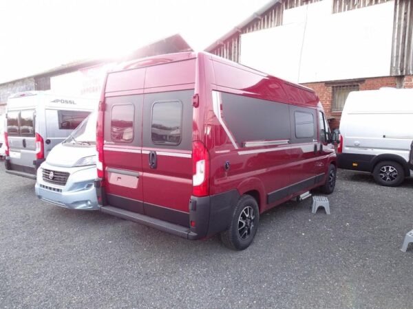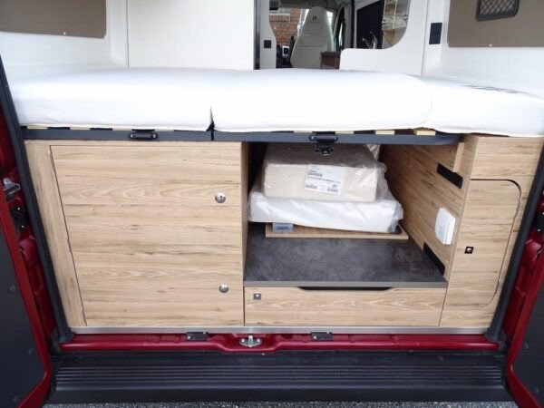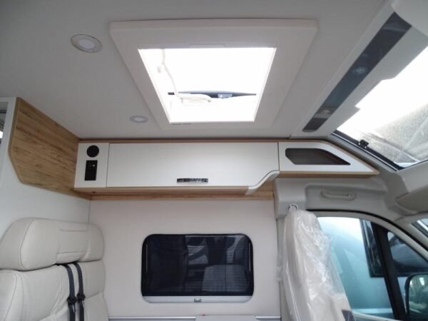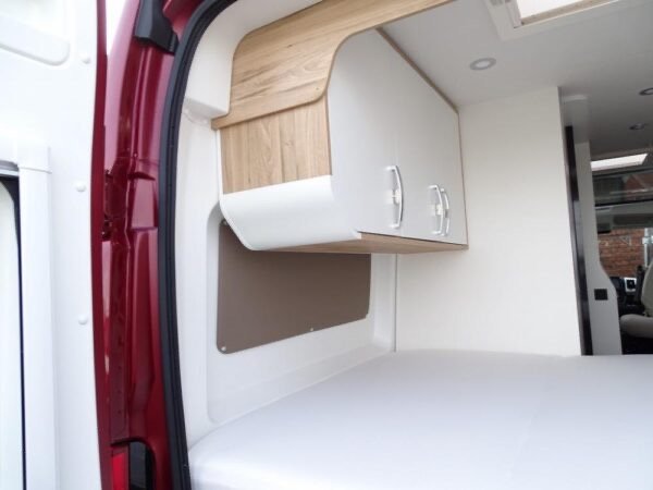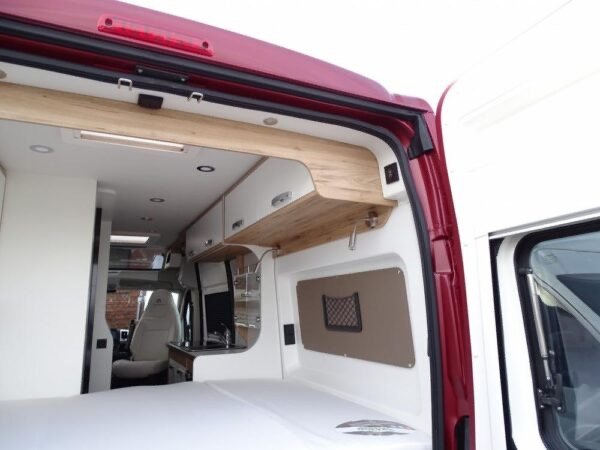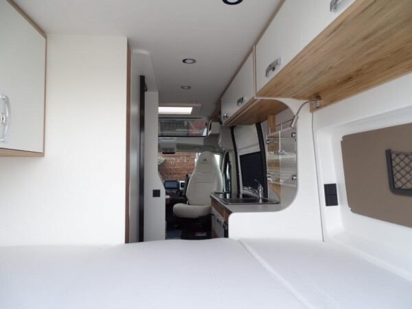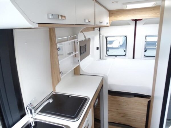 • Fourgon comprenant lit transversal arrière, cuisine avec de nombreux rangements, réfrigérateur, salle d’eau avec douche et WC et salon avant panoramique.