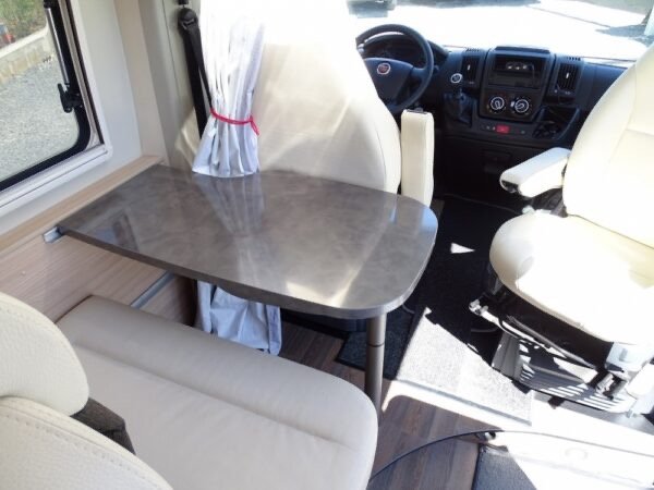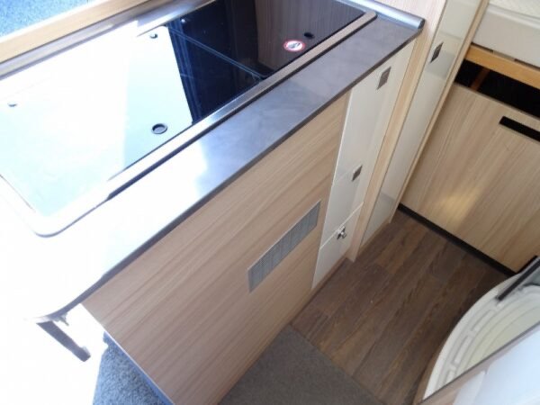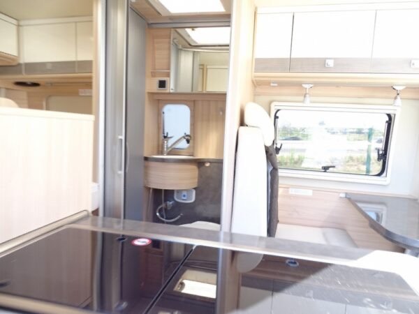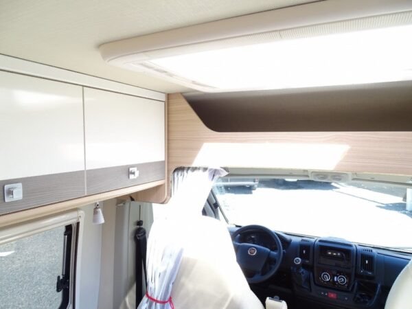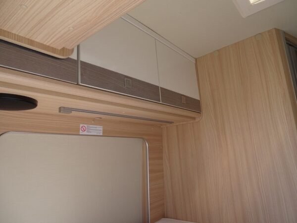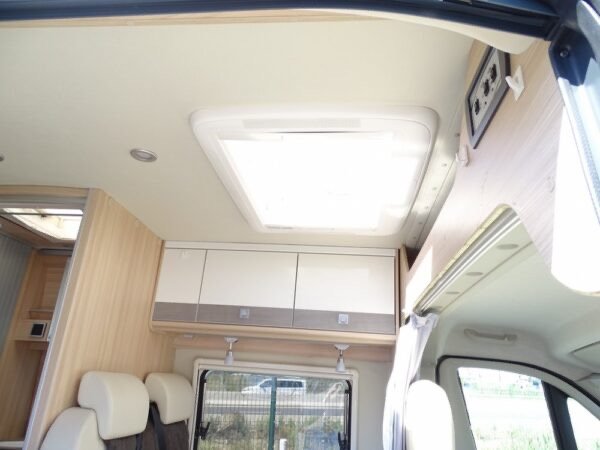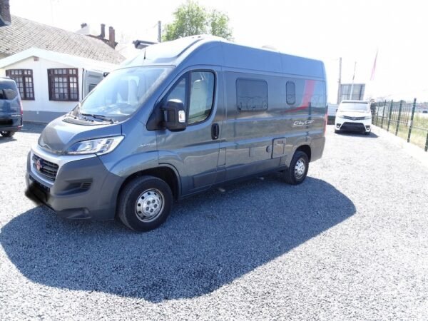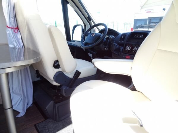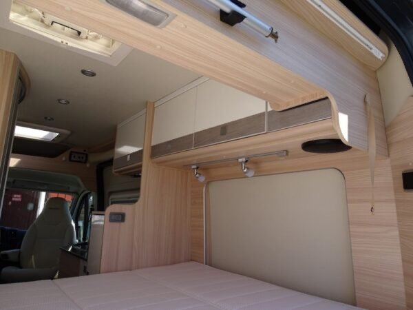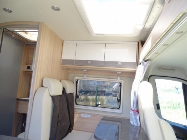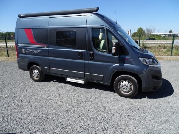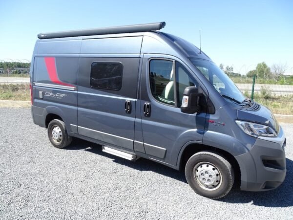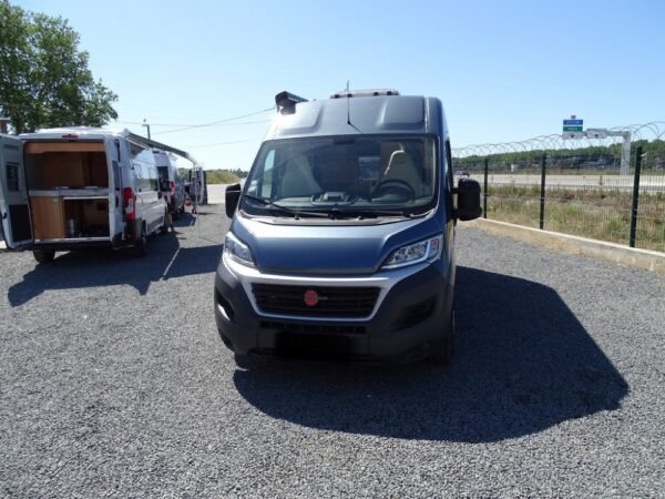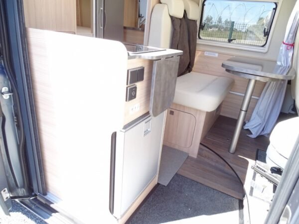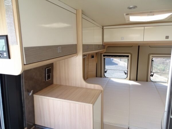 - Fourgon aménagé de 5.41 m de long comprenant un lit transversal, une salle d’eau avec douche et WC, une cuisine avec de nombreux rangements at un salon avant panoramique.